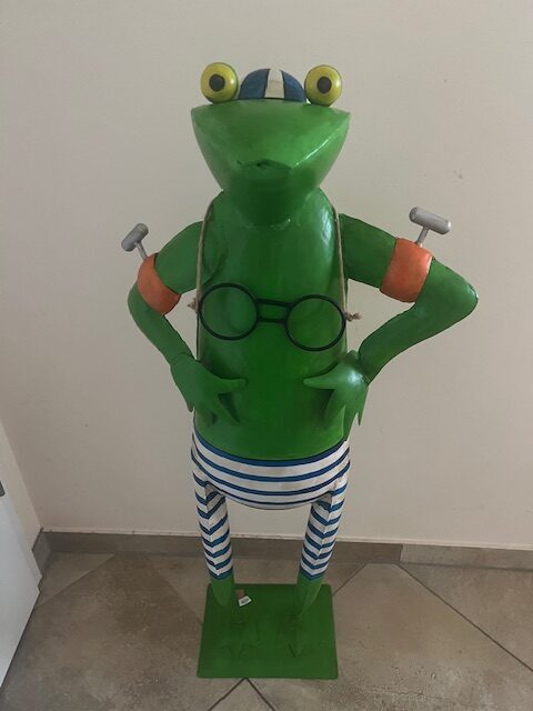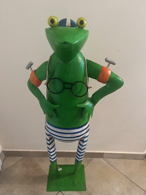 Der XXL Metallfrosch Schwimmer -In seiner blau-weißen Ringel-Badehose schwimmt der Metallfrosch nur mit seinen Schwimmflügel. Der Frosch ist eine richtig gute Laune Gartenfigur. Nicht nur die perfekte Garten-Deko für ihren Teich, Schwimmingpool, auch auf der Terrasse oder im Bad wird er Ihnen, ihren Gästen und Nachbarn viel Freude machen.